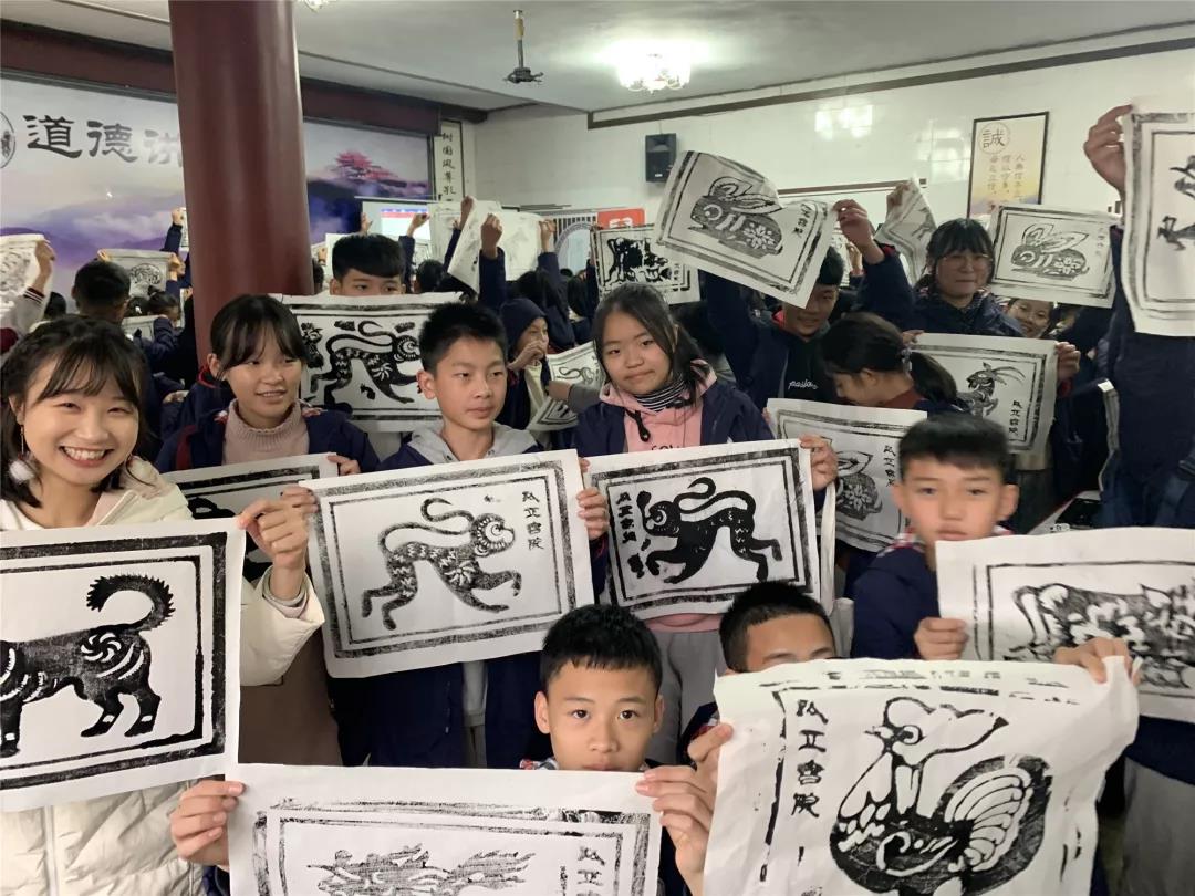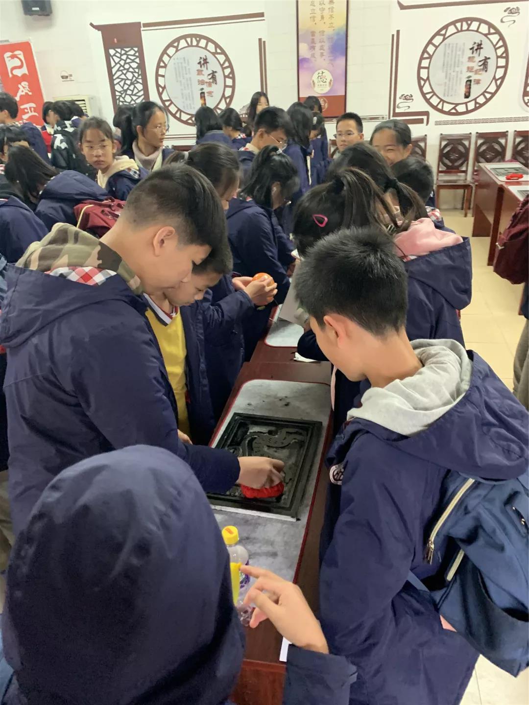 再看看,生肖拓印現場的同學們也非常認真。在講解員的精心講解后,同學們用小盆中的刷子蘸取墨汁在拓板上從上到下的刷。最后用宣紙覆蓋在上面,再用小的紅色物品輕輕的按壓,形成成品??粗粡垙堄H手拓印的生肖畫,同學們可開心了!據說, 還有同學專門為自己父母拓印了生肖圖呢!