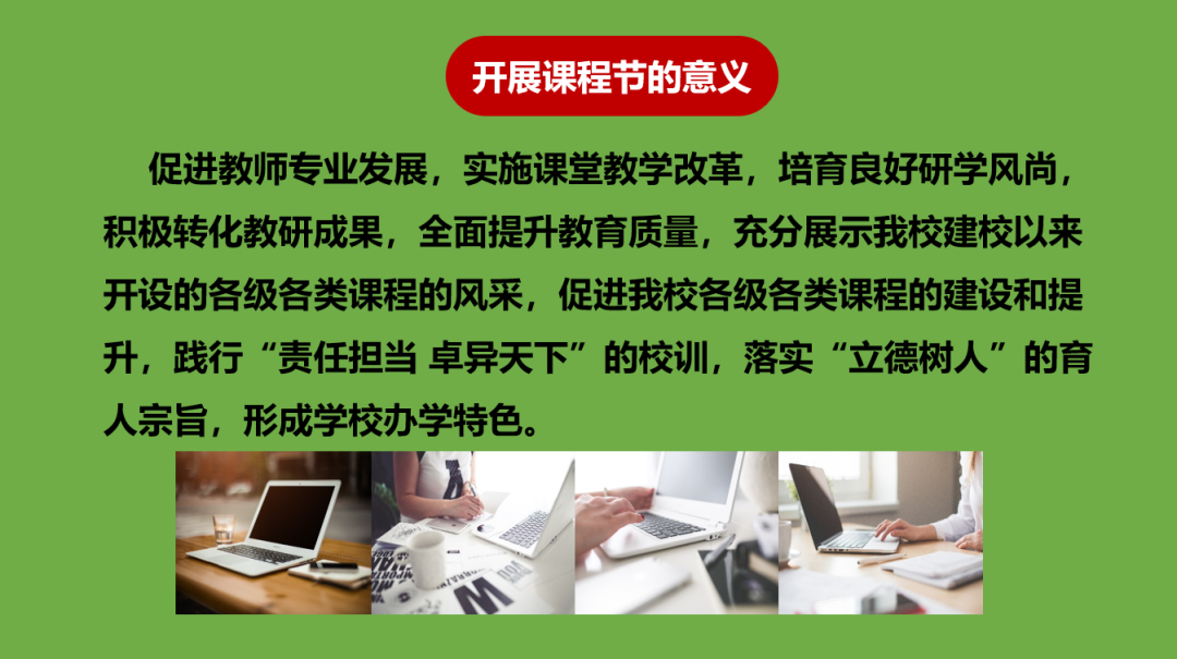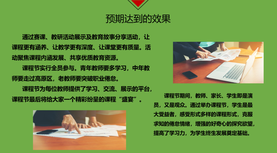 吳燕校長首先從課程節(jié)的意義出發(fā),讓大家明確了課程節(jié)開展的重要意義。然后從國家級課程展示、地方課程展示及校本課程展示、大課堂展示、優(yōu)秀教研活動展示、班主任班會課比賽、家長講堂、優(yōu)秀校本課程匯展及匯演等七個方面進行了具體的闡述,讓大家找到了落實的方向。最后吳燕校長對本次課程節(jié)的圓滿進行表達了衷心的祝愿和滿滿的期待。她表示:本次課程節(jié)為每位教師提供了學(xué)習(xí)、交流、展示的平臺,最后將給大家一個精彩紛呈的課程“盛宴”。課程節(jié)期間,教師、家長、學(xué)生即是演員,又是觀眾。通過舉辦課程節(jié),學(xué)生是最大受益者,感受形式多樣的課程形式,克服求知的倦怠情緒,增強的好奇心的探究欲望,提高了學(xué)習(xí)力,為學(xué)生終生發(fā)展奠定基礎(chǔ)。